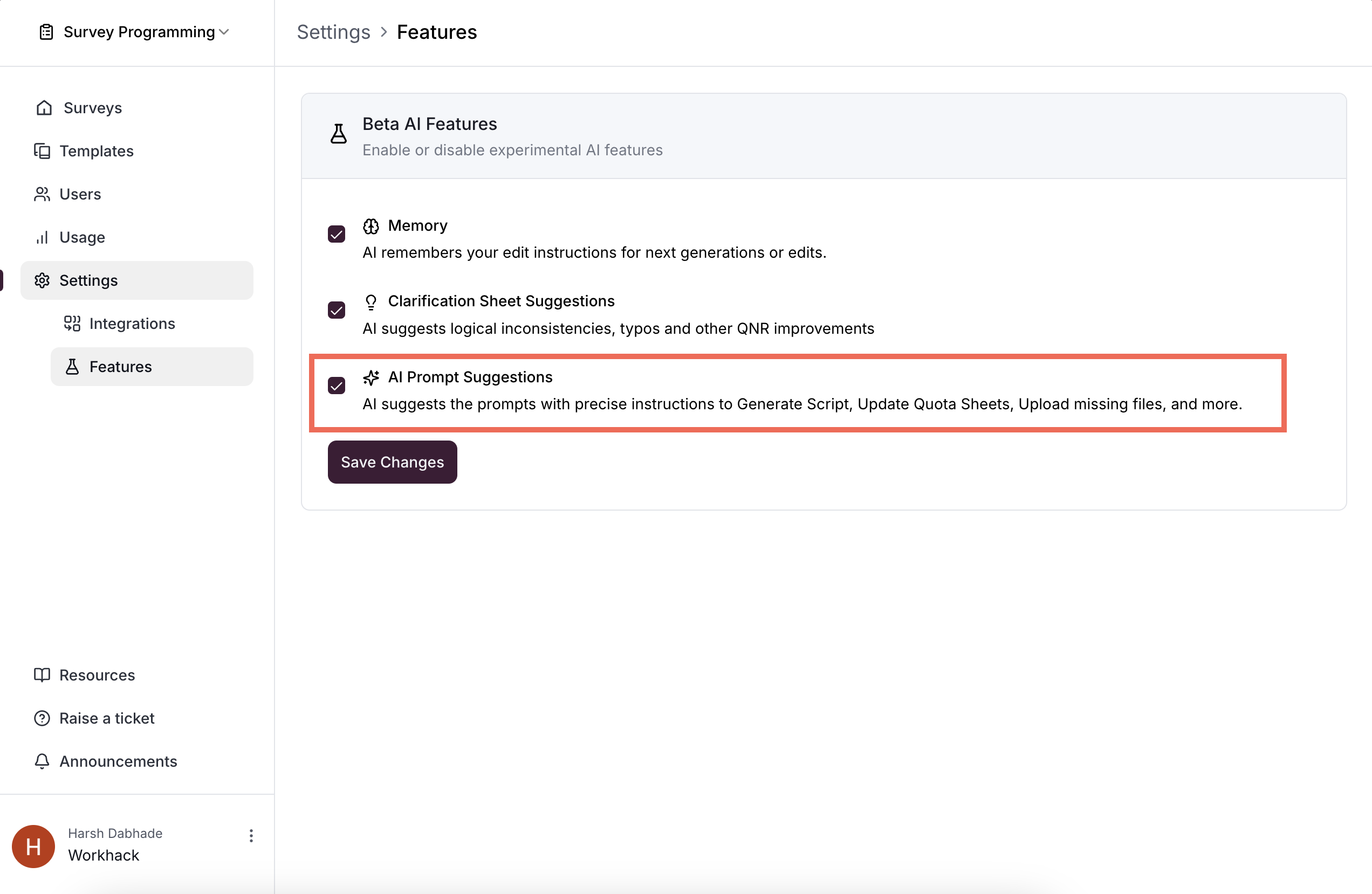 2. Under **Beta AI Features**, enable **AI Prompt Suggestions**