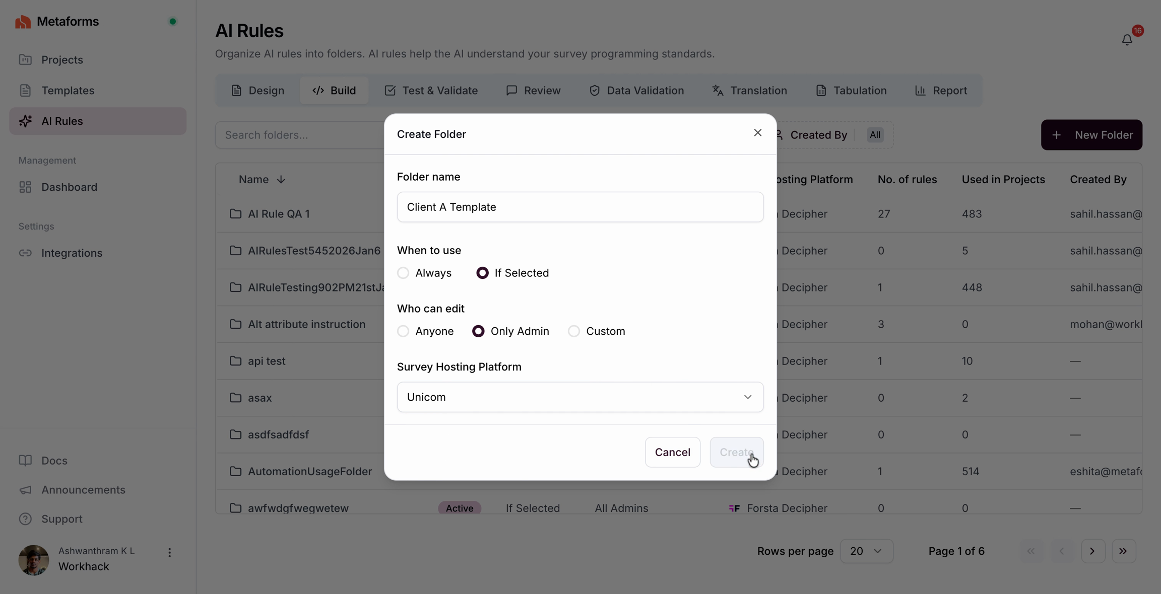 Step 2: Select when to use the folder (Always or If Selected), choose who can edit it, select the Survey Hosting Platform (e.g., Unicom), and click Create.